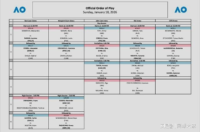 北京时间明天早上8点,2026赛季澳大利亚网球公开赛的大幕将在墨尔本开启。中心球场的揭幕战由萨斯诺维奇和鲍里妮打响。女单头号种子萨巴伦卡坐镇夜场,男单头号种子阿尔卡拉斯紧随其后。大威廉姆斯、拉杜卡努、亚历山德洛娃、万卓索娃、小兹维列夫、布勃利克等名将也将登场亮相。