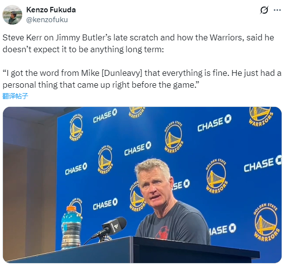究竟巴特勒怎么了?勇士赢球赛后,科尔表示他认为巴特勒不会因此错过接下来的比赛,预计下周二回归,他说道:我从迈克(邓利维)那里得知一切正常,他只是在比赛前遇到了一些私事。