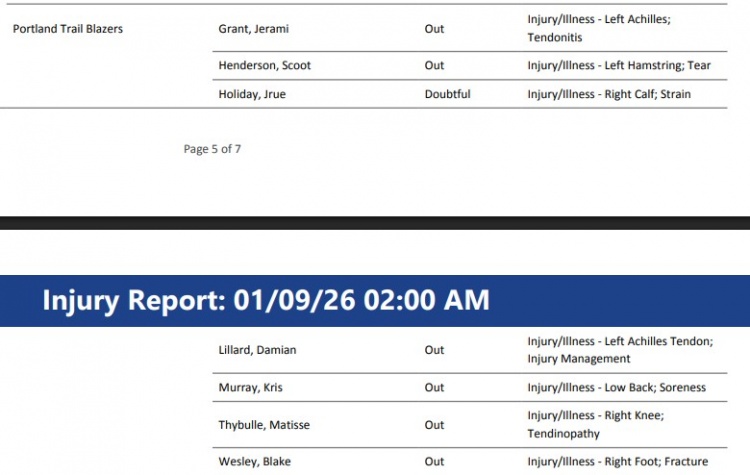 根据最新的伤病报告,格兰特、亨德森、利拉德、克里斯·穆雷、塞布尔、韦斯利明天缺阵,霍勒迪升级为小概率出战。